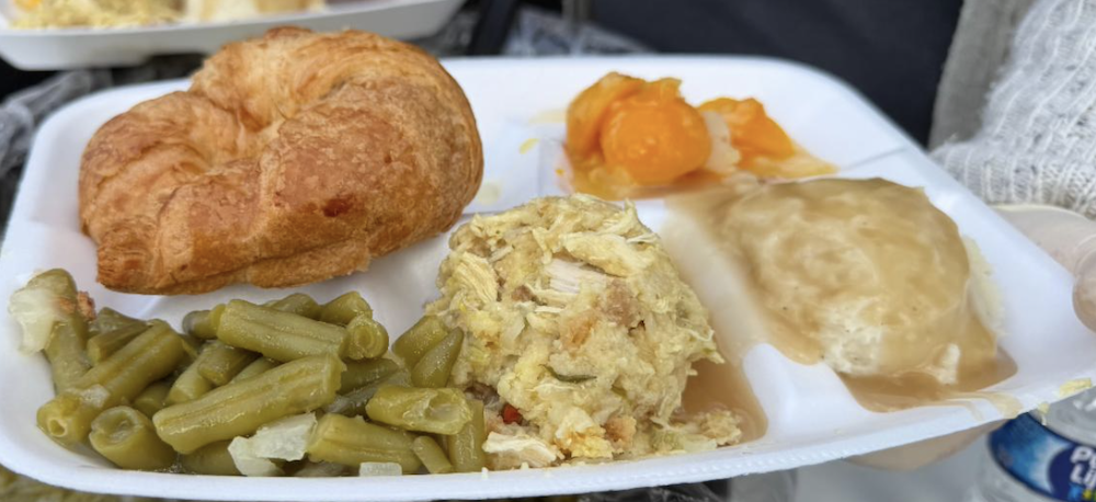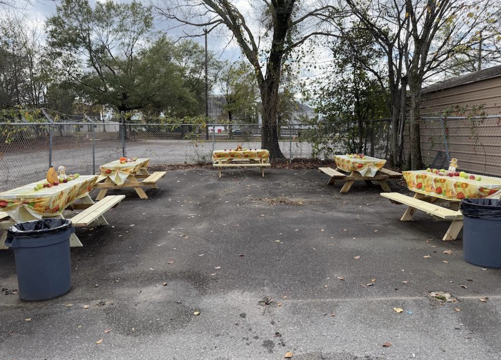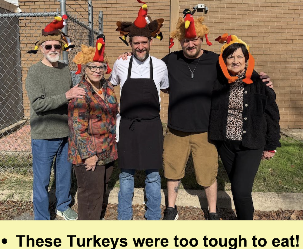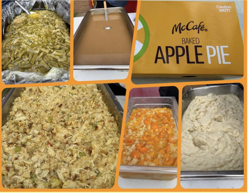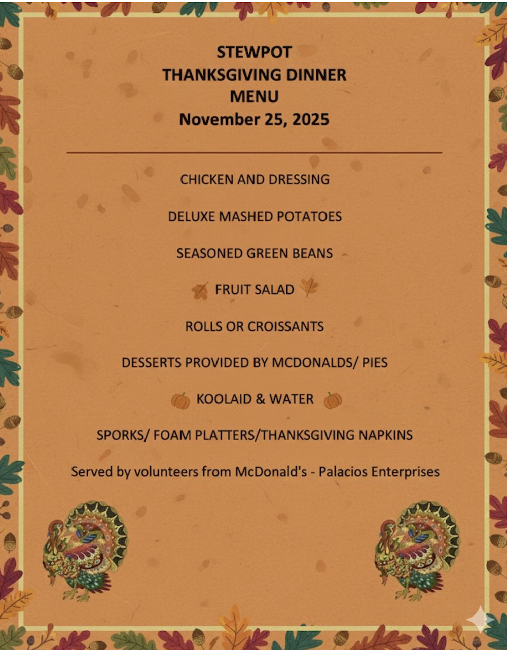 On Tuesday, November 25th, The Stewpot served a Delicious meal to the Stewpot diners. Employes from McDonald’s – Palacios Enterprises.brought pies for dessert (Hot Apple Pies) and helped serve the meal. The Thanksgiving Feast took place in our new seating area. Tablecloths and decorations of leaves and fresh fruit added a festive flair to the great food. The tables allow diners to visit with others as they share the meal.