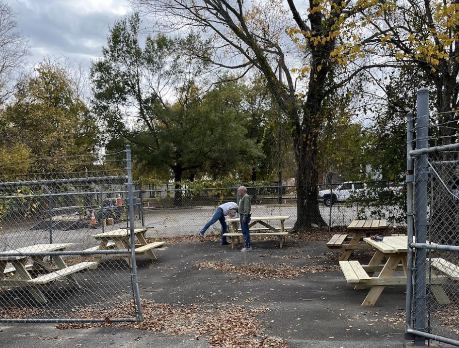 picnic tables to The Stewpot on West Markham in Little Rock. Thanks to these lovingly built tables, diners at The Stewpot now have more places to sit, share a meal, and feel seen. Currently, when the diners pick up their lunches, they have to find somewhere to sit to eat their lunch. The tables were placed in a gated area behind the Salvation Army building. Now when the diners pick up their lunches, they will have a nice comfortable area to eat their lunches. Giving back takes many forms. For this crew, it comes in the
